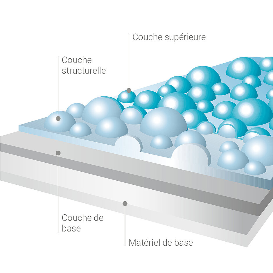 Représentation schématique d'un revêtement des couches TOPOCROM®. Une caractéristique frappante est la structure de surface hémisphérique, qui présente et permet différentes propriétés dans les processus industriels.